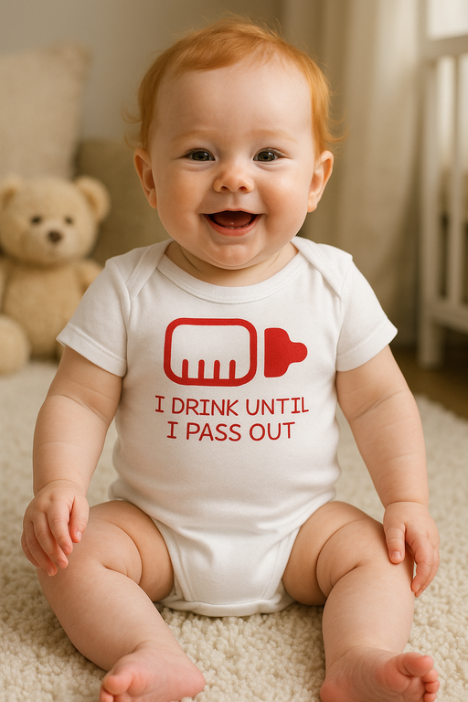 Når sutteflasken er tom, er batteriet også det! 🍼 Hvid bodystocking med rødt print og sloganet I DRINK UNTIL I PASS OUT, der gør hvert bleskift sjovere. Perfekt gave til forældre med humor og små sovetryner.