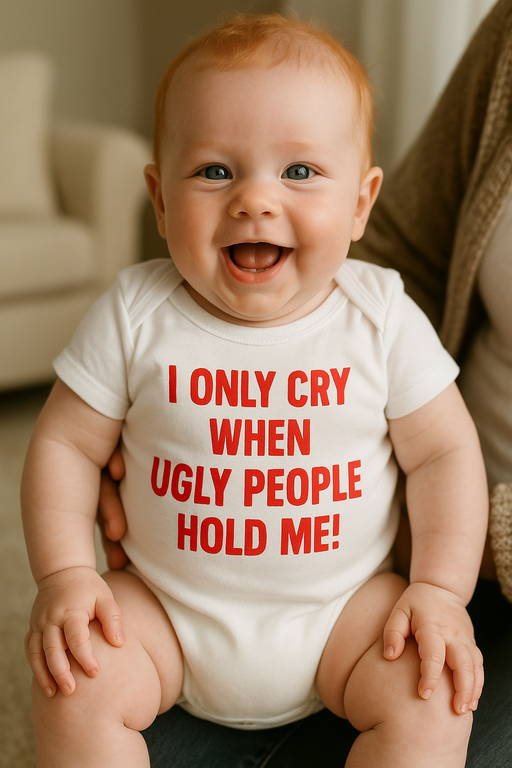 😂 Bodystockingen, der siger det højt: “I ONLY CRY WHEN UGLY PEOPLE HOLD ME!” — så alle ved, hvornår det er tid til at aflevere baby tilbage til mor.