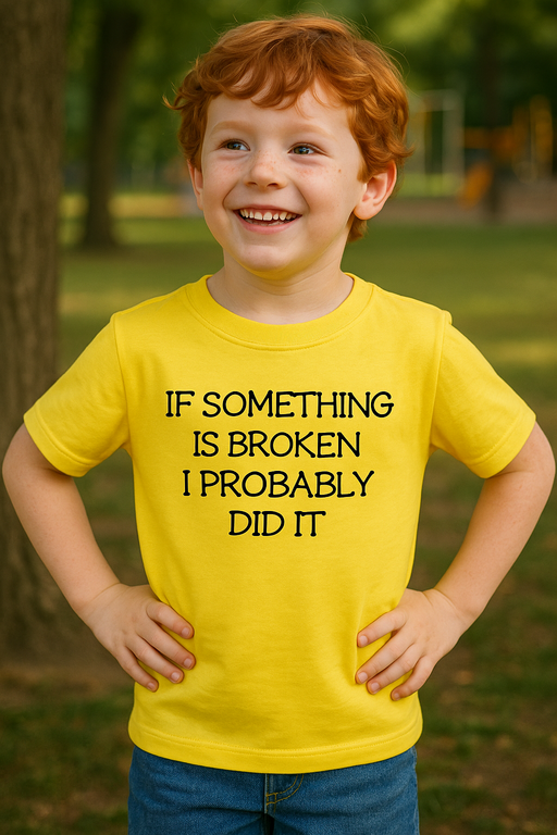Ups, hvem ‘reparerede’ denne gang? 😄 Denne gule børne-T-shirt med printet IF SOMETHING IS BROKEN I PROBABLY DID IT siger sandheden, før du når at spørge. Perfekt til små opdagelsesrejsende og stolte mæcener af kaos! 🚀