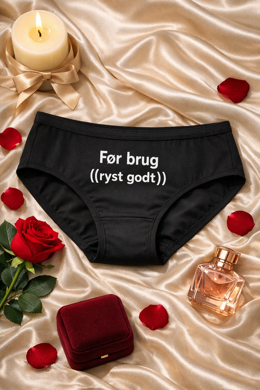 Før brug ((ryst godt)) – en fræk lille tekst, der bryder rutinen, skaber grin og sætter stemningen på et splitsekund, når lyset (måske) bliver slukket.
