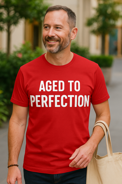🍷✨ Rød T-shirt, der siger det højt og tydeligt: AGED TO PERFECTION — og du nikker selvsikkert. Til alle, der ikke bliver gamle, men modner som god vin og samler komplimenter i stedet for lys på kagen.