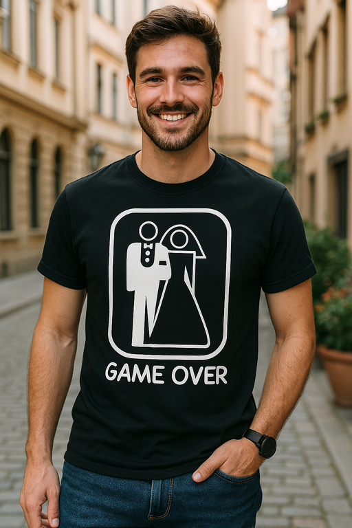 Når du siger ‘ja’, tænder skiltet: GAME OVER. 😜 Den sorte T-shirt med brudgom og brud siger det hele uden lange taler. Perfekt til polterabender, bryllupsfester og par med sort humor! 💍