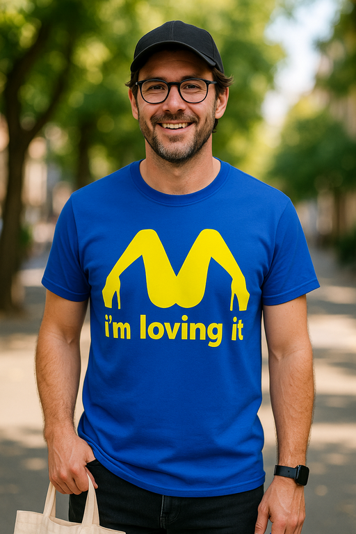 🍟 Når benene tegner et M, råber dit outfit: i’m loving it! Denne blå kortærmede T-shirt med et gult grafisk M formet af kvindeben i høje hæle er opskriften på et øjeblikkeligt smil. Du tager den på, og folk ved ikke, om de skal klappe eller bestille en ekstra portion jokes.