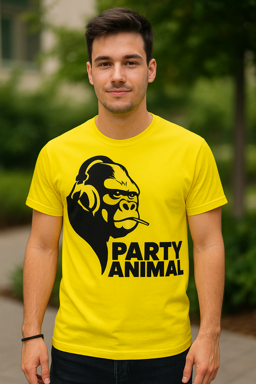 Gul som en diskolampe, med en gorilla i høretelefoner og en tandstik – denne T-shirt skriger: PARTY ANIMAL! 🦍🎧 Ideel til festaber, DJ’er og alle med fredag i sjælen. 🎉