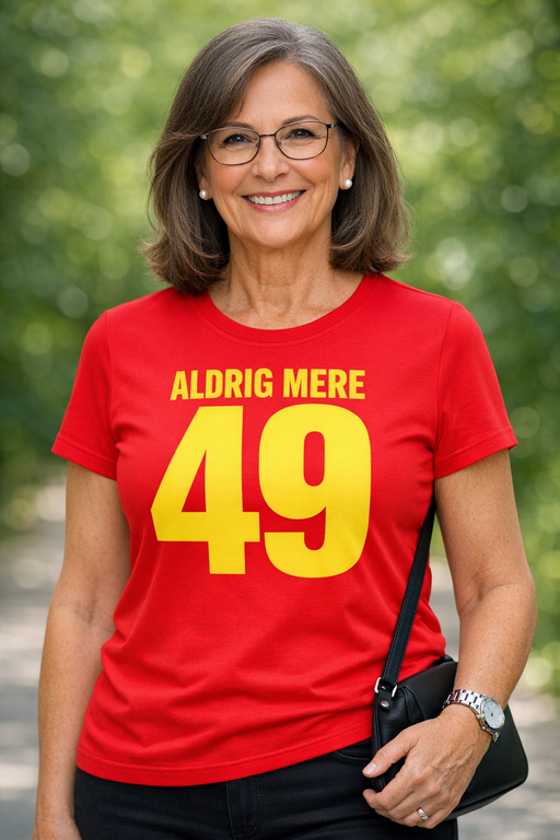 Klar, fræk og umulig at overse: Den knaldrøde t-shirt med gul tekst råber “ALDRIG MERE 49” og sætter stemningen, så snart du træder ind.