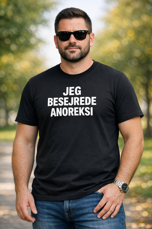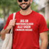 En enkel sort t-shirt med et skarpt, hvidt statement, der blander selvironi og attitude—og næsten garanterer et grin eller en kommentar.