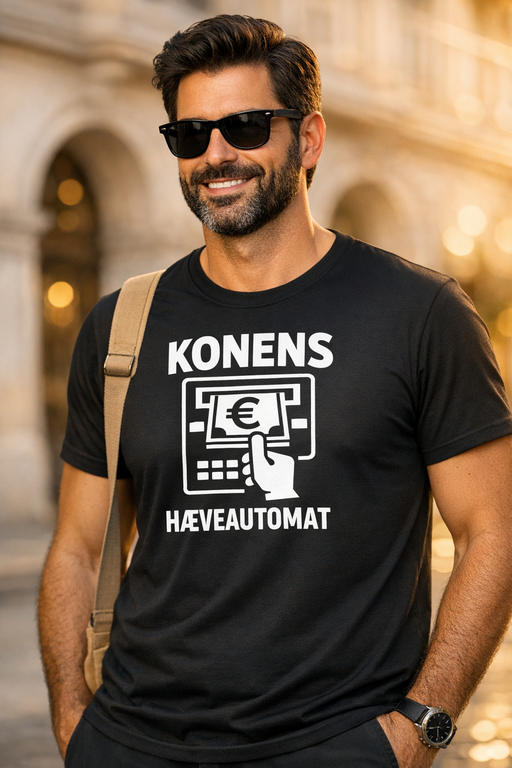 En sort t-shirt med et frækt, genkendeligt statement: KONENS HÆVEAUTOMAT – perfekt til at sætte stemningen og sikre grin på billederne, før nogen når at “hæve”.