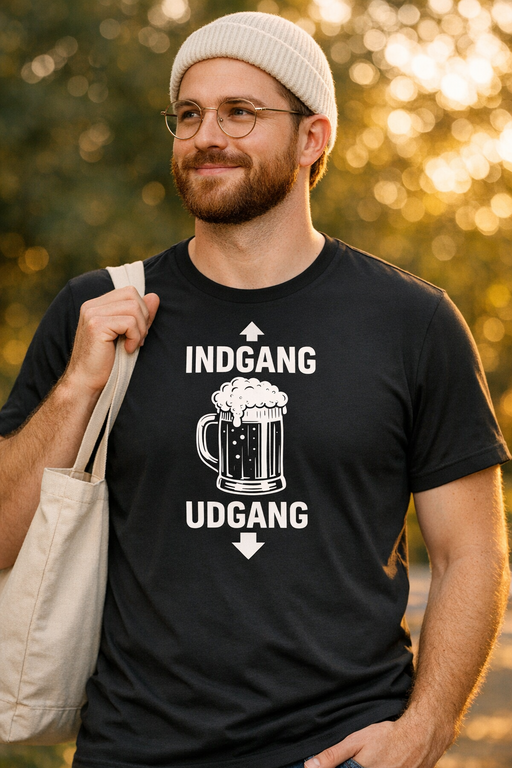 Den sorte tee med ølkrus i midten og de sjove pile INDGANG og UDGANG giver grin på stedet – et lille, frækt vink til den klassiske øl-logik.
