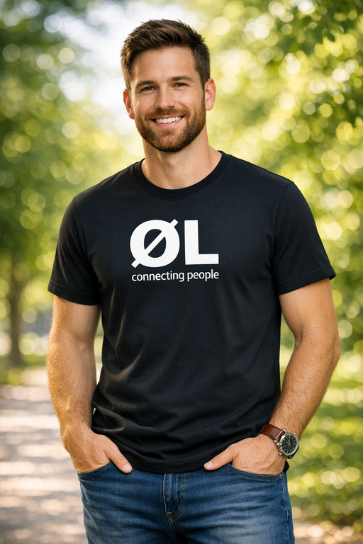 Når der bliver åbnet en øl, bliver der også åbnet for selskabet. Den sorte t-shirt med teksten “ØL connecting people” siger det, alle tænker – højt og tydeligt.