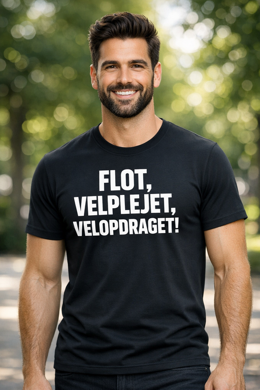 En sort t-shirt med et selvsikkert, hvidt statement: FLOT, VELPLEJET, VELOPDRAGET! Perfekt når du vil have komplimenterne til at komme af sig selv – med et glimt i øjet.