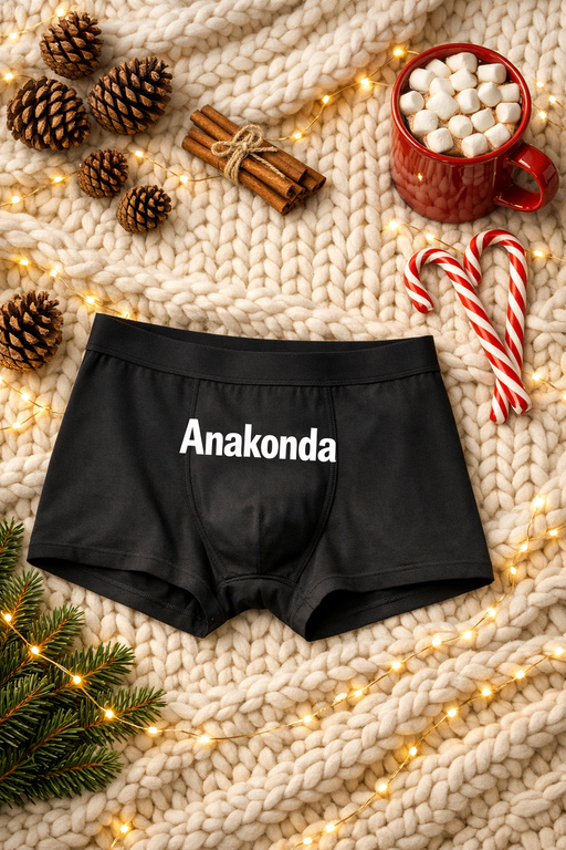De sorte boxershorts med det tydelige Anakonda-print siger det hele, før du når at sige et ord – frækt, sjovt og lige til at grine af.