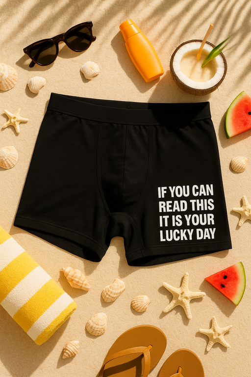 🍀 Hvis man kan læse det, kan man vinde hjertet — IF YOU CAN READ THIS IT IS YOUR LUCKY DAY! Disse sorte herre-boksershorts med dristig hvid tekst siger det klart: I dag er en heldig dag! Fra fitness til sofaen leverer de smil og sætter prikken over i’et på din stil. Perfekte, når du vil have lidt charme, masser af god energi og et strejf af frækhed.