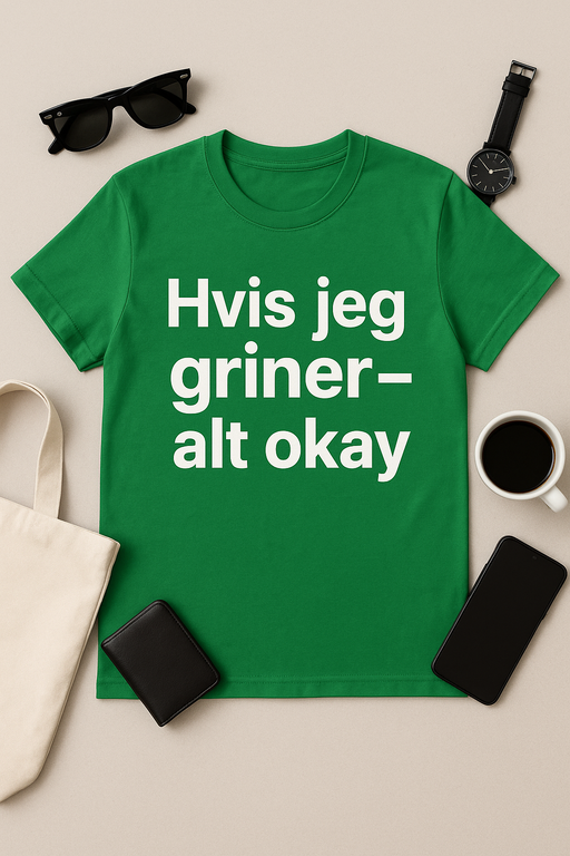 Er du træt af at skulle forklare, hvordan du har det? Lad din t-shirt tale for dig! Med teksten ‘Hvis jeg griner – alt okay’ fortæller du verden, at humoren stadig lever, selv når alt andet brænder. Perfekt til hverdag, søndagsbrunch og de der mystiske Zoom-møder. Fremstillet i blød bomuld, så komforten matcher din attitude. Gør din garderobe sjovere – og send et klart (og grinende) signal til omverdenen!