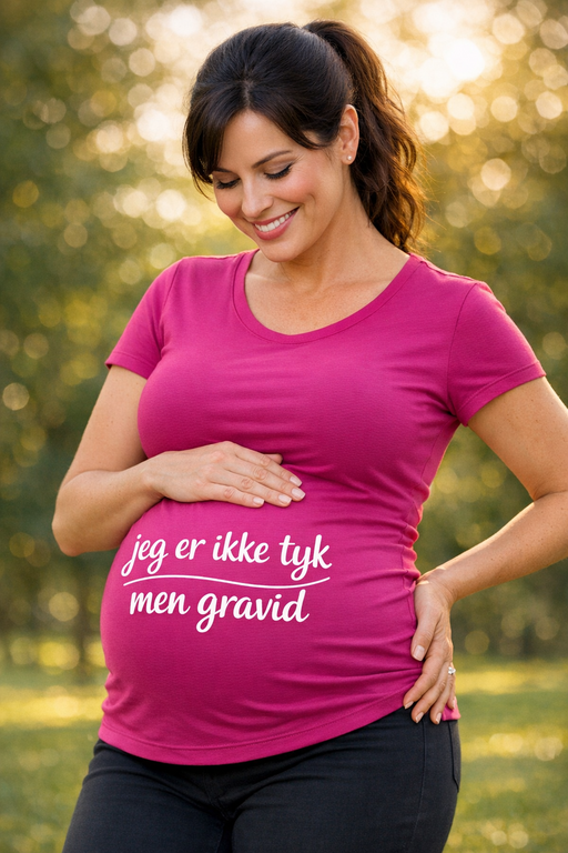 En sjov og ærlig statement-t-shirt, der gør det nemt at tage kommentaren på forskud: Jeg er ikke tyk, men gravid – sagt med charme og selvtillid.