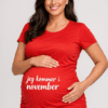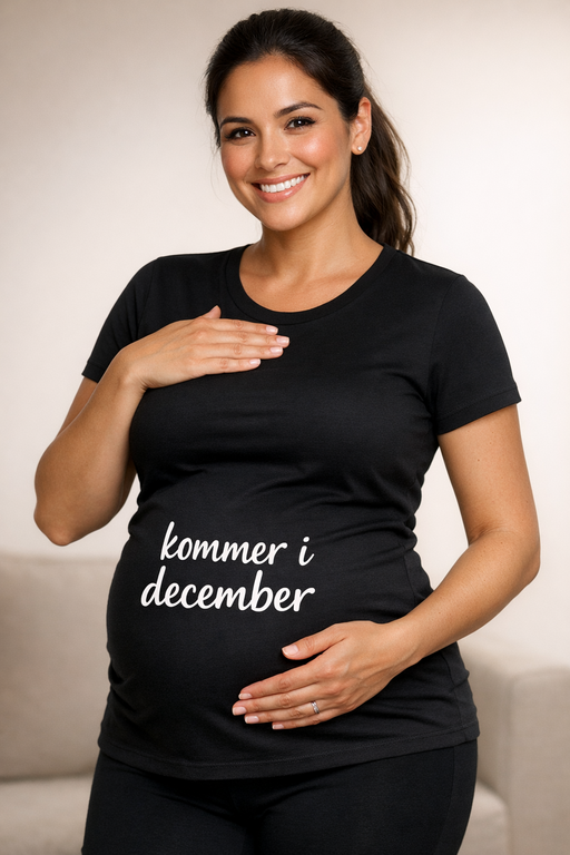 Din mave hvisker, men denne t-shirt siger det klart: kommer i december. Den sorte farve og det hvide print giver et rent, moderne look, der gør din store nyhed nem at dele – både til hverdag og på billeder.
