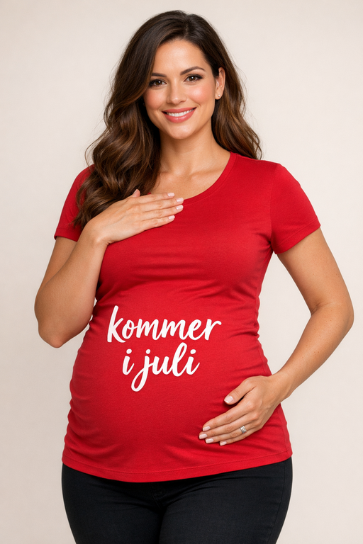 Slip for spørgsmålet “hvornår er du sat til?” – denne røde graviditets-t-shirt med kommer i juli gør det nemt at dele din store nyhed med stil og et smil.