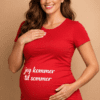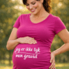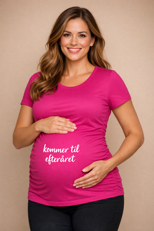 En iøjnefaldende hot pink graviditets-t-shirt med hvid tekst kommer til efteråret – den perfekte, sjove måde at lade maven “tale” og få alle til at smile.