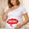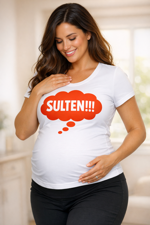 SULTEN!!! – når cravings rammer, behøver du ikke sige et ord. Den hvide graviditets-t-shirt med rød tankeboble leverer budskabet med humor og gør enhver tur i supermarkedet (eller til sofaen) lidt sjovere.