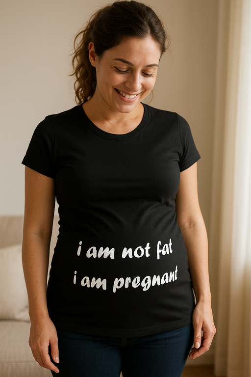 Maven på march, kommentarer på pause! 🤰😄 Denne sorte T-shirt til gravide med korte ærmer og teksten I am not fat I am pregnant stopper de selvudnævnte rådgivere ved første blik. Brug den med stolthed — verden forstår endelig, at det ikke er tid til kur, men til kram og snacks!